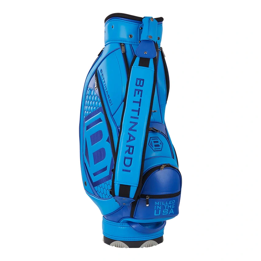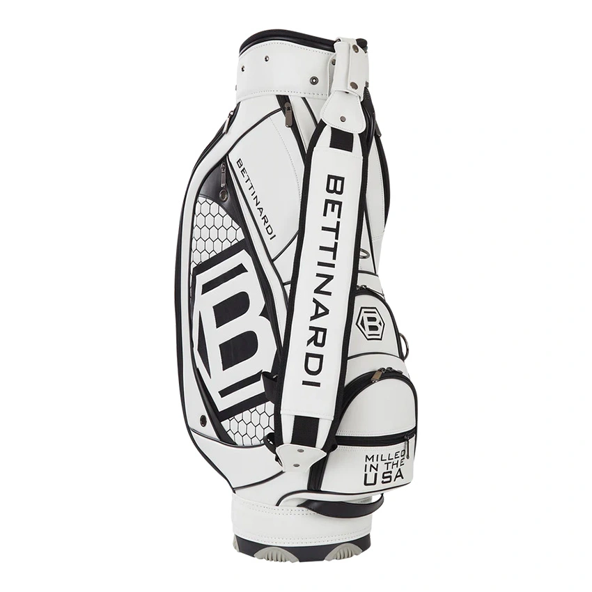 The perfect size Bettinardi premium staff bag, inspired by our Tour Dept. bags, is the perfect lightweight golf bag for those dedicated golfers looking for the ultimate professional appearance and functionality. This classic black and white appearance feature Bettinardi logos stitched throughout the bag with Milled in The USA and the American flag proudly stitched on the removable front flap. A total of six dividers for all your clubs and nine total pockets including a trusty spot for your golf umbrella. The only question you’ll be asking about this bag is whether you game it or put it in your office!